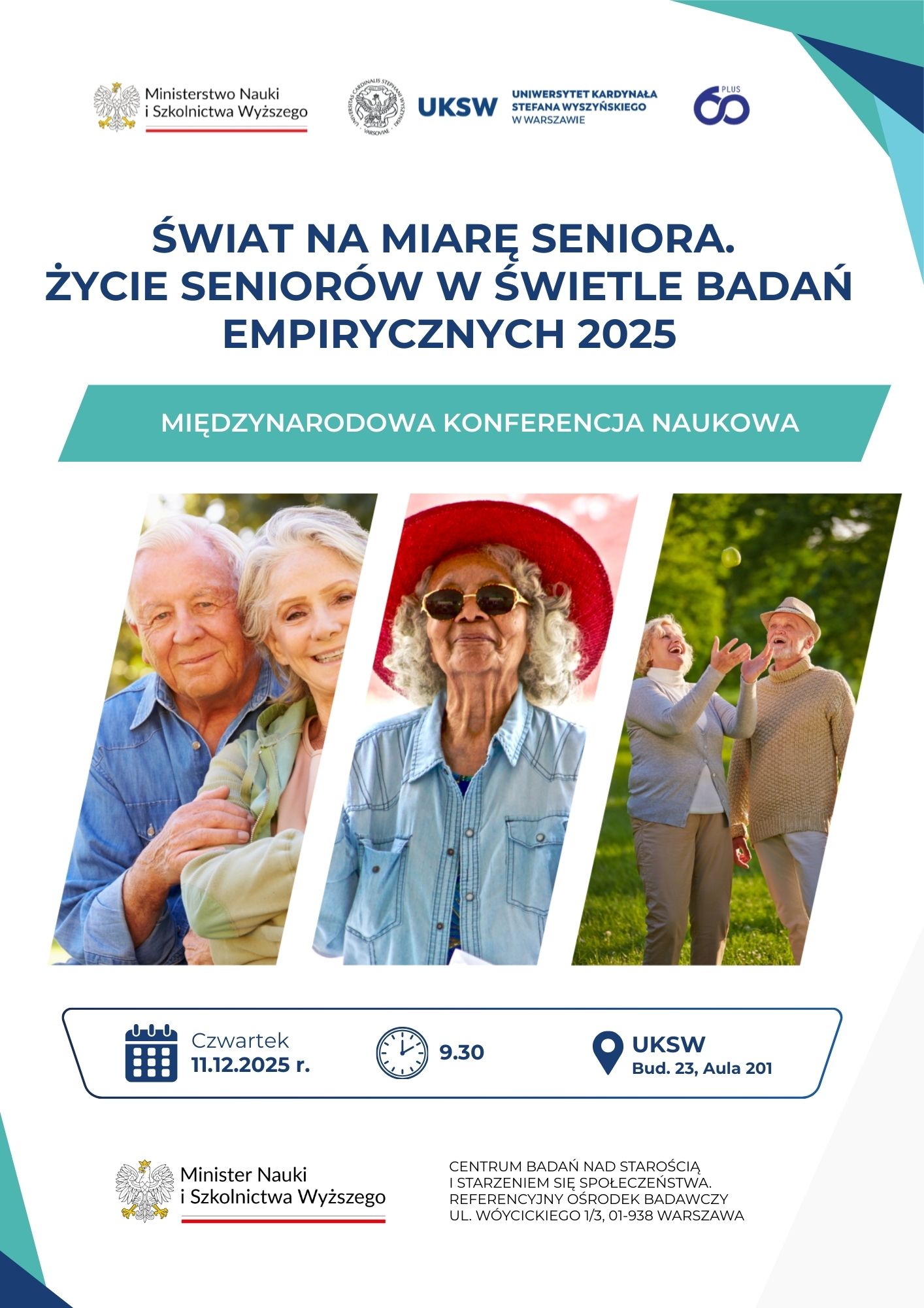 11 grudnia 2025 r. na Uniwersytecie Kardynała Stefana Wyszyńskiego w Warszawie odbędzie się międzynarodowa konferencja naukowa pt. „Świat na miarę seniora. Życie seniorów w świetle badań empirycznych 2025”. Wydarzenie organizowane jest przez Centrum Badań nad Starością i Starzeniem się Społeczeństwa – Referencyjny Ośrodek Badawczy UKSW. Obrady rozpoczną się o godz. 9.30 w Auli 201 (budynek 23) na kampusie przy ul. Wóycickiego.