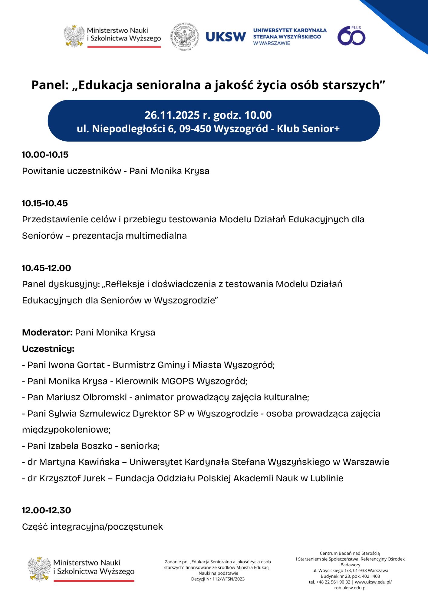 26 listopada 2025 r. o godz. 10.00 w Klubie Senior+ przy ul. Niepodległości 6 w Wyszogrodzie odbędzie się panel poświęcony edukacji senioralnej oraz wpływowi działań edukacyjnych na jakość życia osób starszych. Wydarzenie organizowane jest w ramach projektu dotyczącego testowania Modelu Działań Edukacyjnych dla Seniorów.