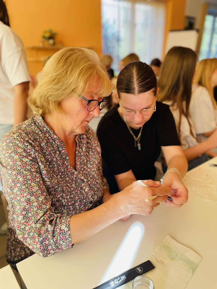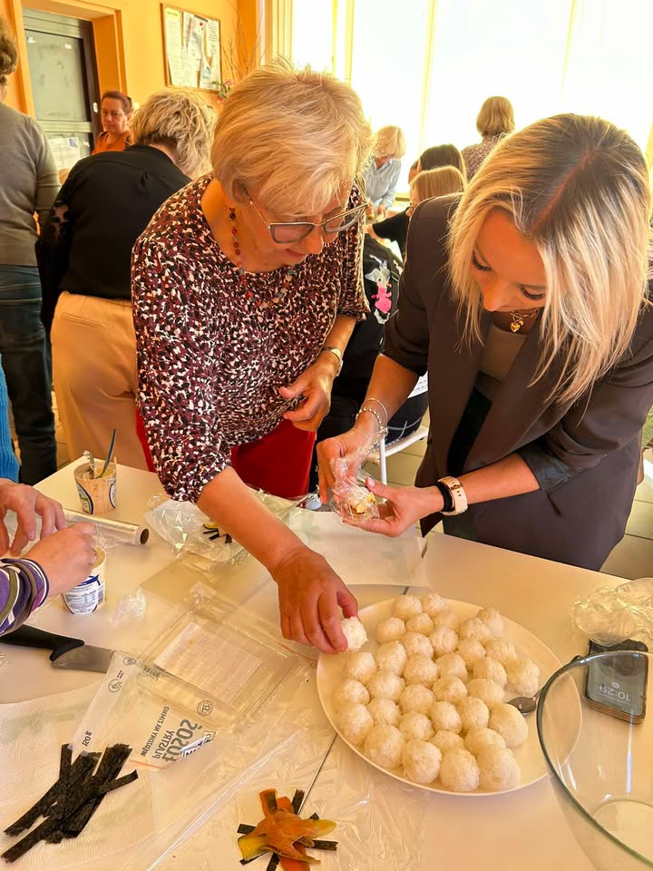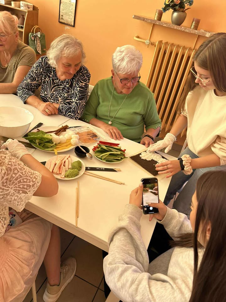 Seniorzy i młodzież wspólnie uczyli się przygotowywać tradycyjne japońskie sushi. Pod okiem doświadczonej instruktorki ćwiczyli krojenie składników, rolowanie i układanie potraw, odkrywając kulinarne tajniki kuchni japońskiej. Spotkanie przebiegło w atmosferze kreatywności, nauki i dobrej zabawy.