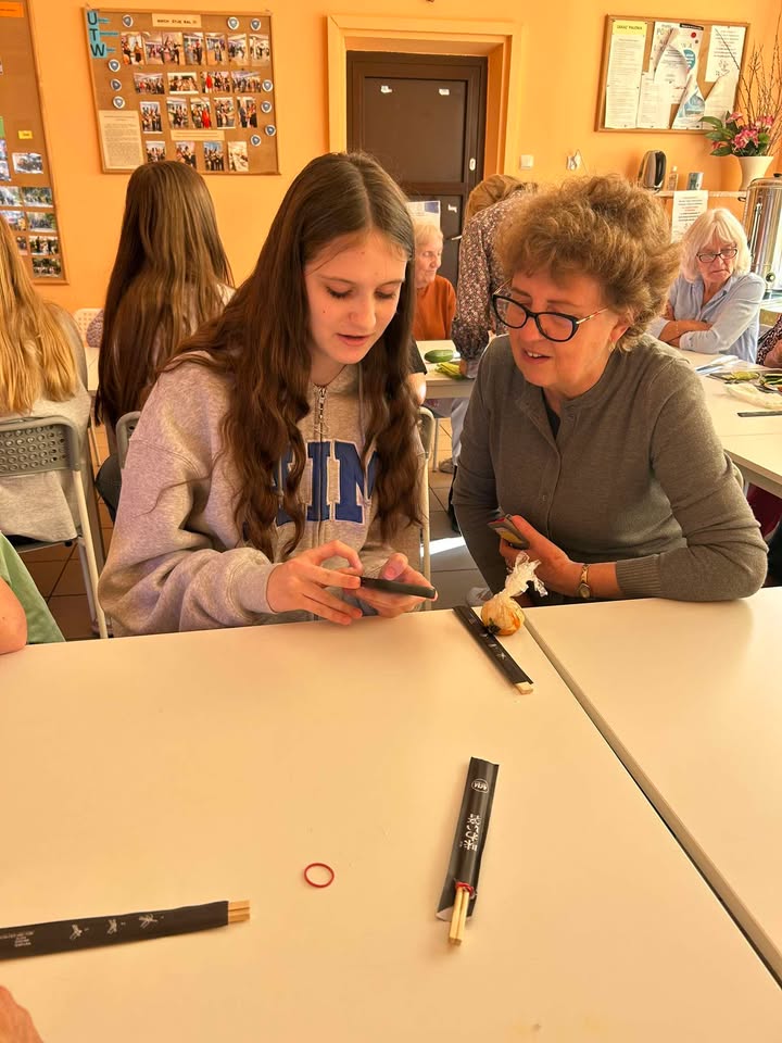 Drugą część warsztatów poświęcono nowym technologiom. Młodzież pomogła seniorom w nagrywaniu krótkich materiałów wideo w aplikacji TikTok, pokazując, że nowoczesne rozwiązania mogą być źródłem radości i wspólnej integracji niezależnie od wieku.