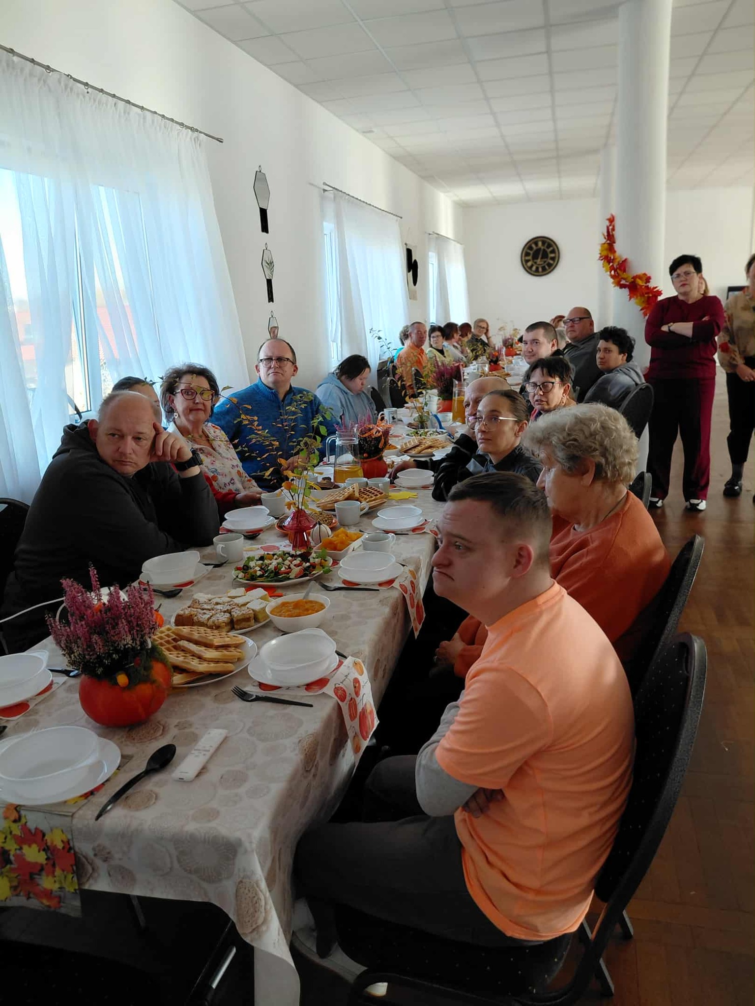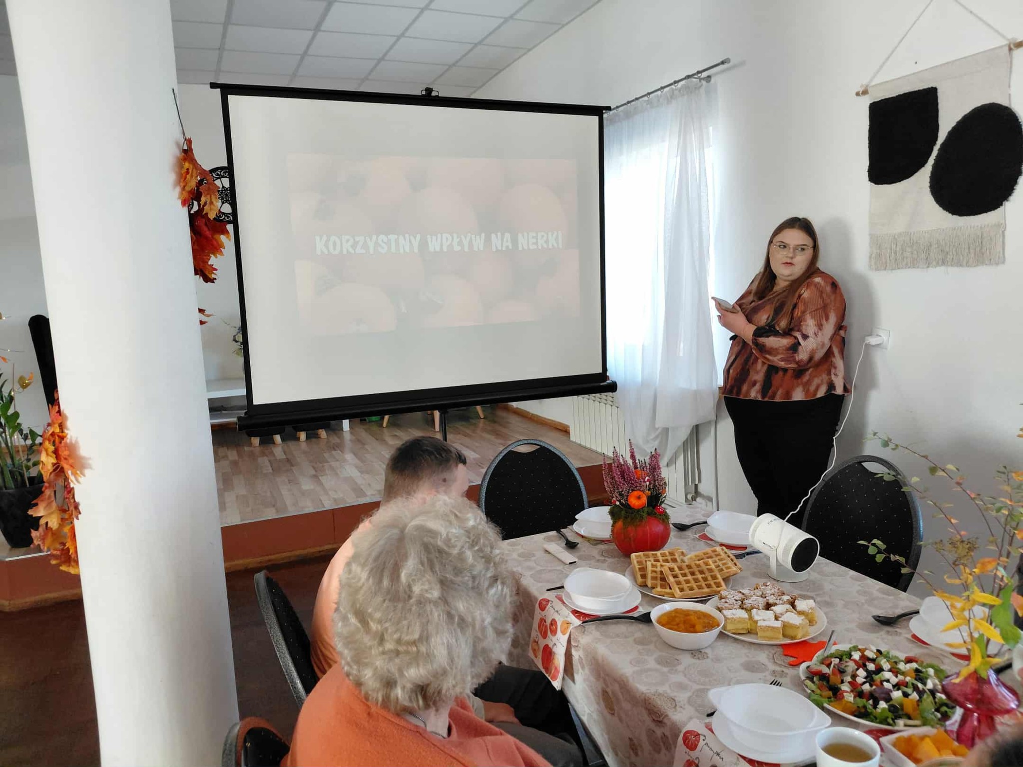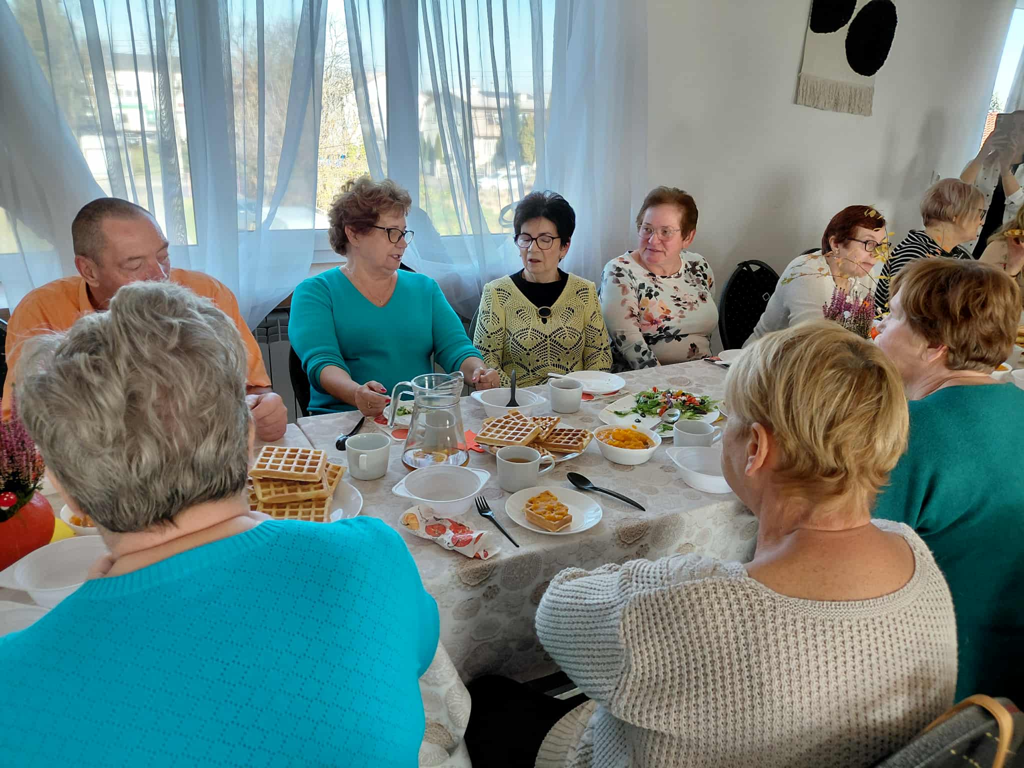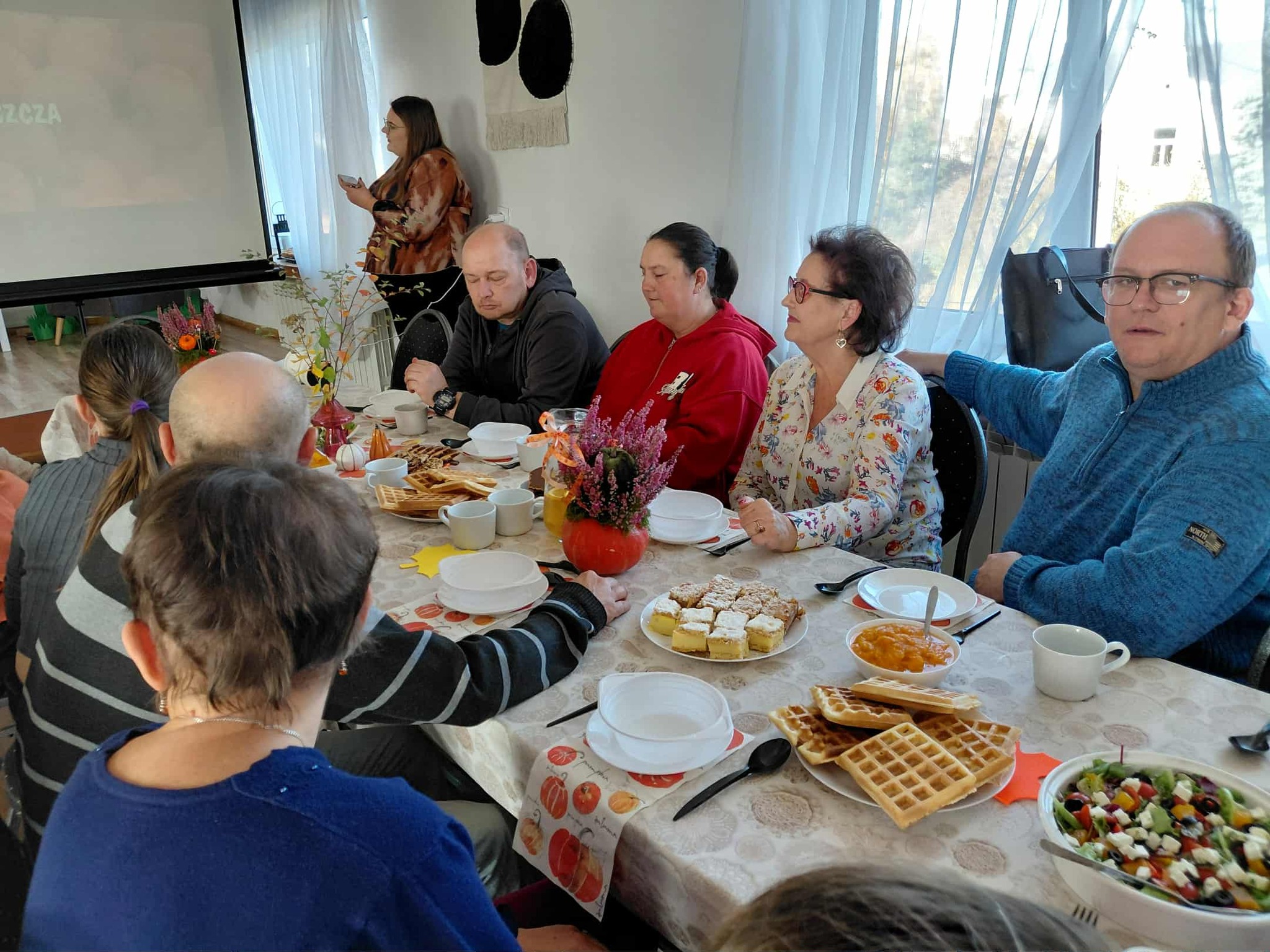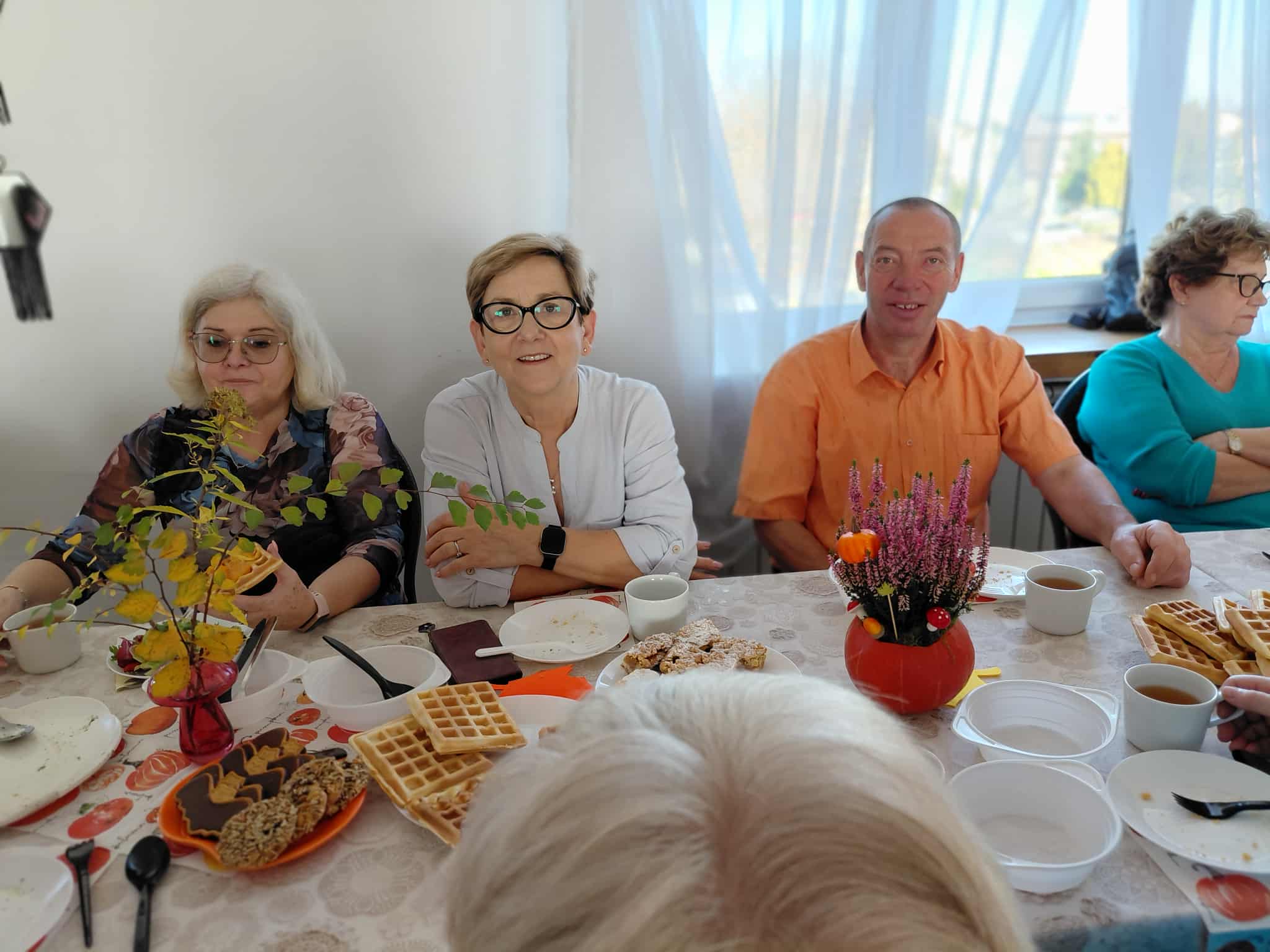 Drugą część spotkania stanowiły warsztaty kulinarne. Uczestnicy przygotowali m.in. gofry z musem z dyni i pomarańczy, zupę gulaszową, sałatkę z dynią, szarlotkę, napoleonkę oraz zimową herbatę. Wszystkie potrawy zachwyciły zarówno smakiem, jak i estetyką podania. Zajęcia kulinarne miały również wymiar edukacyjny – seniorzy poznali wartości odżywcze przygotowywanych dań, ucząc się, jak komponować smaczne i zdrowe posiłki.